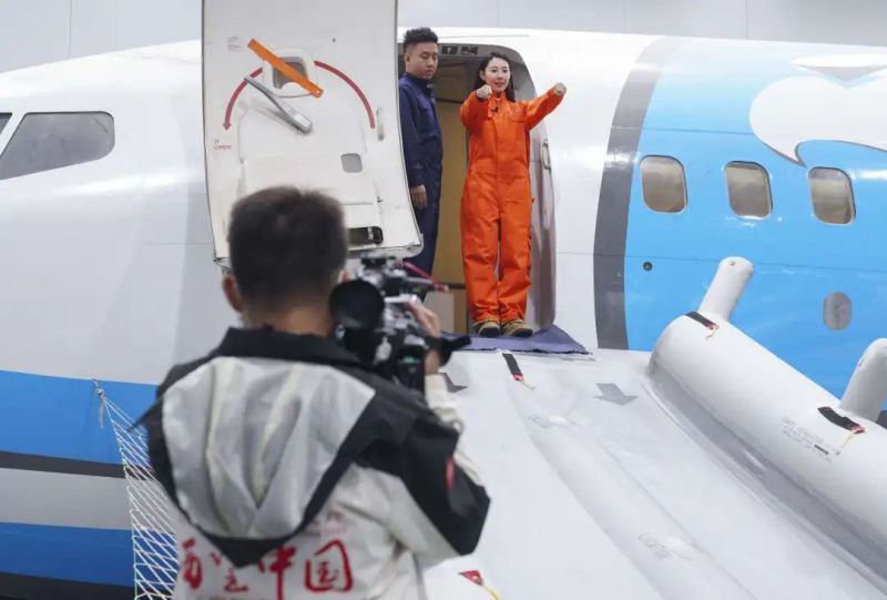 “模拟机驾驶舱一比一还原了真实飞机驾驶舱的布局,可实现飞行场景的全程模拟,与真正的飞机驾驶舱飞行体验感基本完全一致。”在西北云翼飞行训练中心,报道团了解了中心业务内容和发展方向,并在现场教员的指导下体验了模拟飞行和客舱应急疏散等内容。